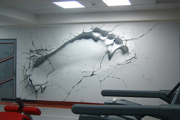 Более того, полотна с трехмерным эффектом используют для оклеивания наружных поверхностей помещения. На фото ниже оригинальная и весьма креативная идея с оформлением ворот гаража.