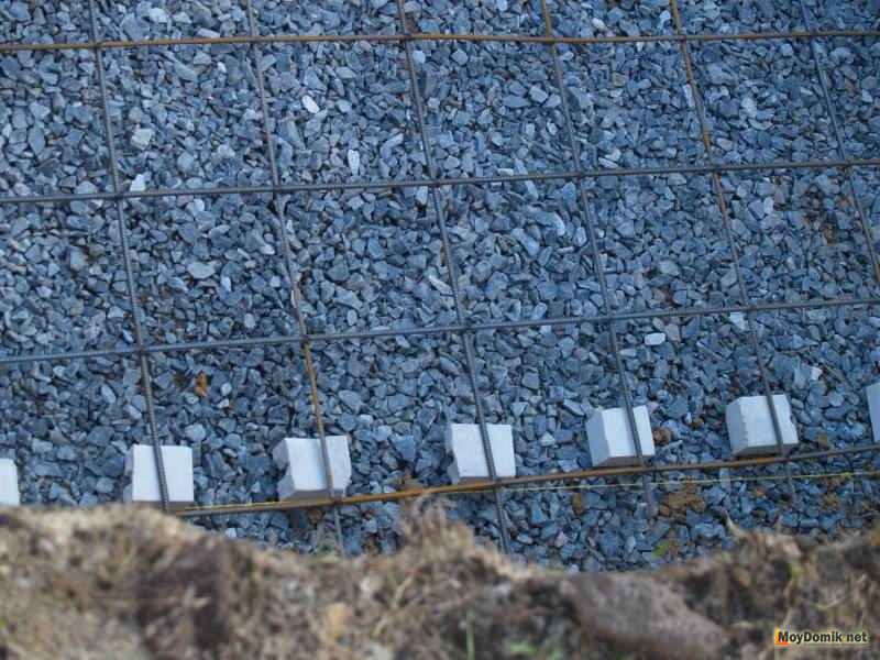 Под арматуру нужно что-то подложить, например, кирпич, это для того, чтобы она в процессе заливки бетонного раствора осталась в середине бетонного основания.