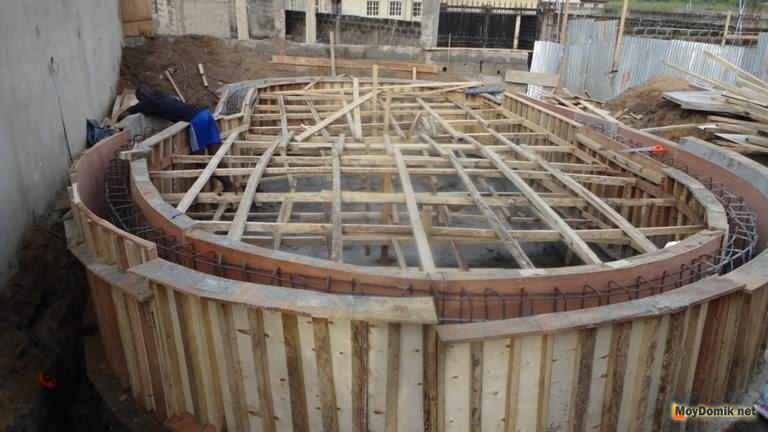 Установка опалубки из фанеры более затратное, зато качество поверхности бетонной чаши получается почти идеальным.