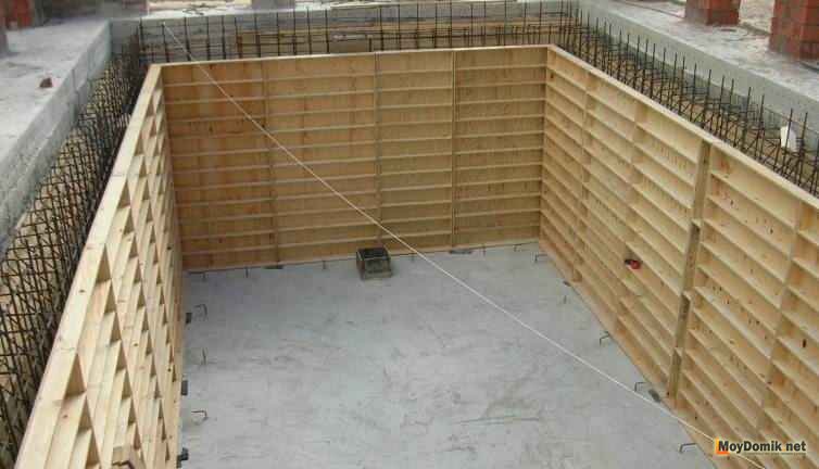 В качестве материала для устройства опалубки применяется деревянная доска (окрашенная или проолифленная) или, что более удобно – фанера (желательно влагостойкая или ламинированная). Использование фанеры позволяет создать гнутые формы при минимуме усилий, что актуально при строительстве бассейна сложной или овальной формы.