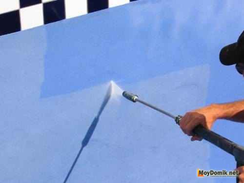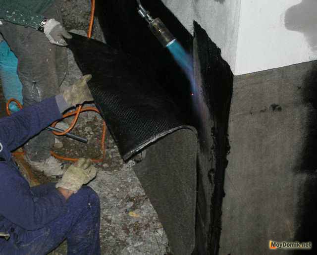 Нанесение гидроизоляции производится специальными жидкими растворами, между слоями которых прокладывается армирующая ткань (сетка).