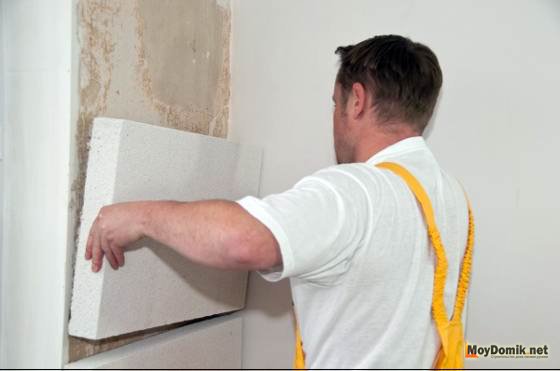 Приступаем к монтажу пенопласта на стену. Работу начинают снизу, с удаленного угла.