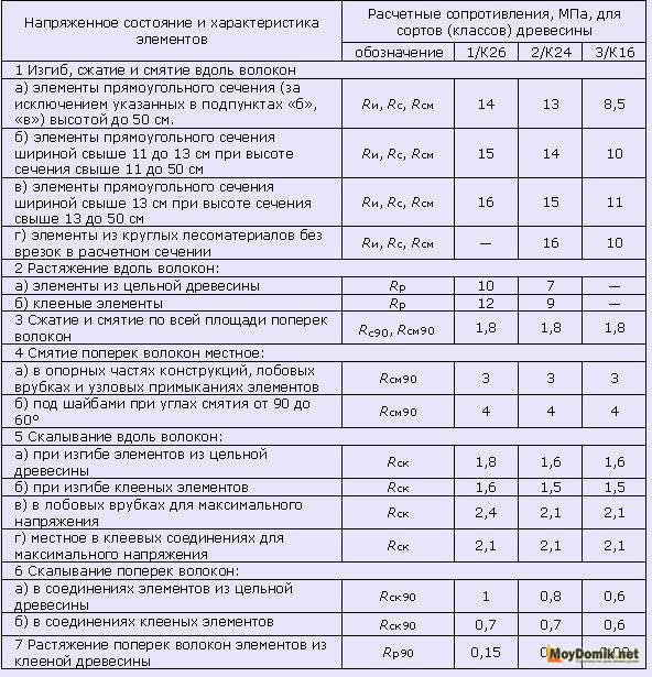 R - сопротивление древесины, приведенное в СНиП II-25-80 (СП 64.13330.2011) «Деревянные конструкции» введенные в эксплуатацию в 2011 г.