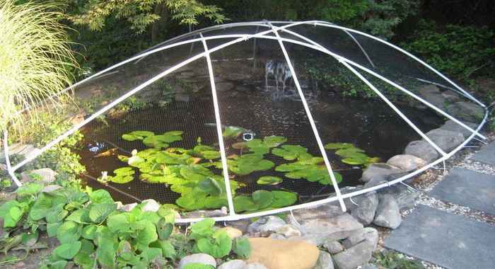 - защиту пруда от листьев обеспечит конструкция из сетки на легком каркасе.