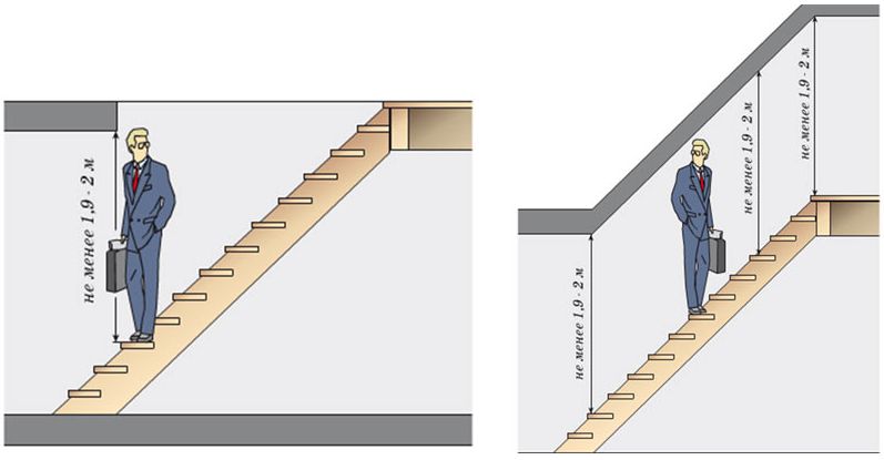 Расстояние от ступени до потолка можно рассчитать так: берется рост самого высокого члена семьи и прибавляется 100 мм. Рекомендуемое значение просвета (рабочая высота лестницы) – 2 м. Эта величина должна быть постоянной на протяжении всего марша.