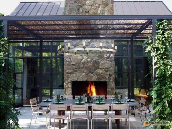 Европейские беседки всегда выглядят очень современно. Их фишка в легкости конструкций, продуманной подсветке и эргономичном расположении мебели.