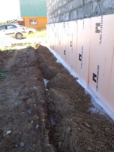 - установка пенополистирола (или пеноплекса) на поверхность фундамента (цоколя дома), он будет выполнять функцию утеплителя и компенсационного зазора между фундаментом и бетоным основанием;
