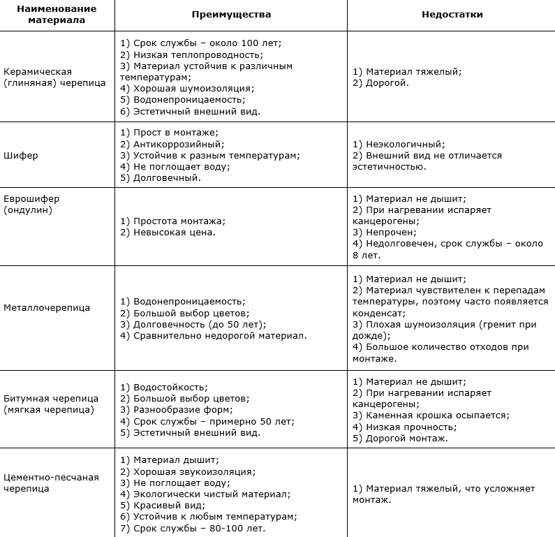 Сравнительный анализ преимуществ и недостатков кровельных материалов приведен в таблице.