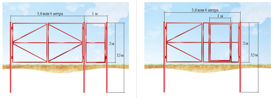 Также учитывается ширина опорных столбов (колон). При способе установки ворот с отдельно стоящей калиткой будет три столба. Кроме этого, нужно учесть величину зазоров между опорными столбами и рамой каркаса. А также размер зазора между створками распашных ворот с учетом параметров фурнитуры.