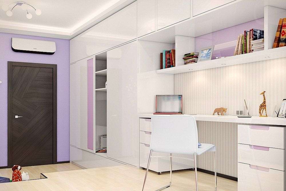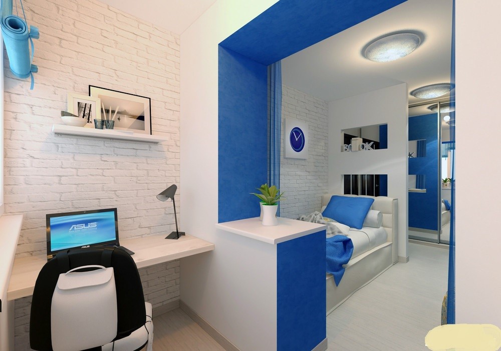 Функциональные зоны визуально выделяют искусственным светом. На потолке вешают люстру или регулируемые светильники споты. Над кроватью – бра, снабженное выключателем-реостатом для регулировки яркости (интенсивности) освещения. Хорошее освещение стола получают с помощью настольного LED-светильника или точечных галогенных лампочек, вмонтированных в нижнюю часть навесной полки.