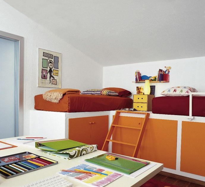 Непросто на нескольких квадратных метрах создать комфортное пространство, в котором было бы удобно двум детям, причём разнополым. Учитывая возраст, пол и темперамент, комната для двух школьников может быть оборудована двухъярусной кроватью, если позволяет площадь детской – двумя одинаковыми столами (или одним Г-образным). Детям обязательно выделяют по личной тумбочке или шкафу. Глобально разделить детскую между двумя детьми можно зонировав комнату цветом, светом и расстановкой мебели. Как, например, на фото: