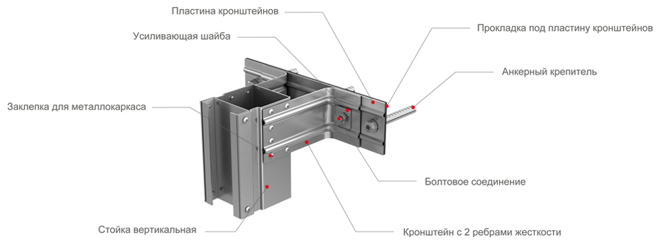 Система крепежей включает в себя несущие профили, кронштейны, анкеровочные элементы (дюбели и шурупы), специальные крепежные детали. Использование кронштейнов для вентфасада дает возможность регулировать расстояние между каркасом и стеной, благодаря чему отсутствует необходимость в выравнивании поверхности стен;